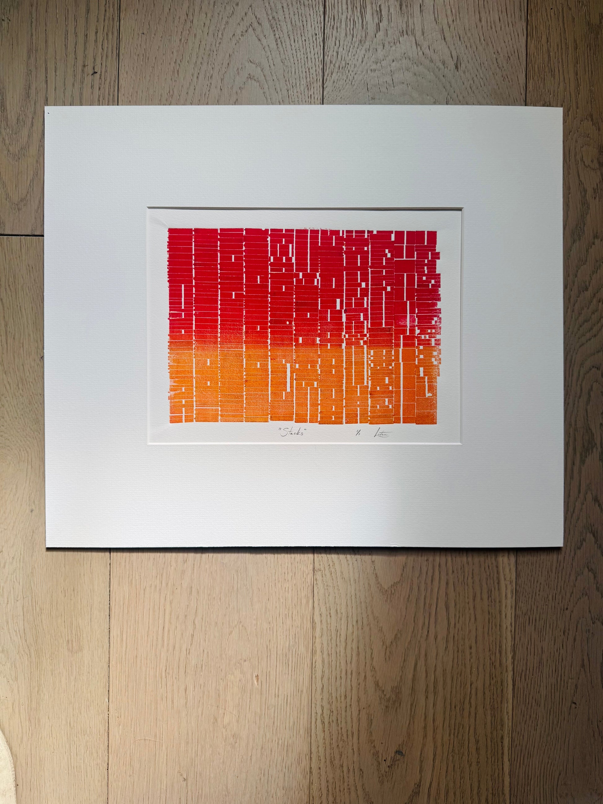 "Stacks" Abstract Red and Orange Letter Type MonoPrint 19x16 inches. Matted