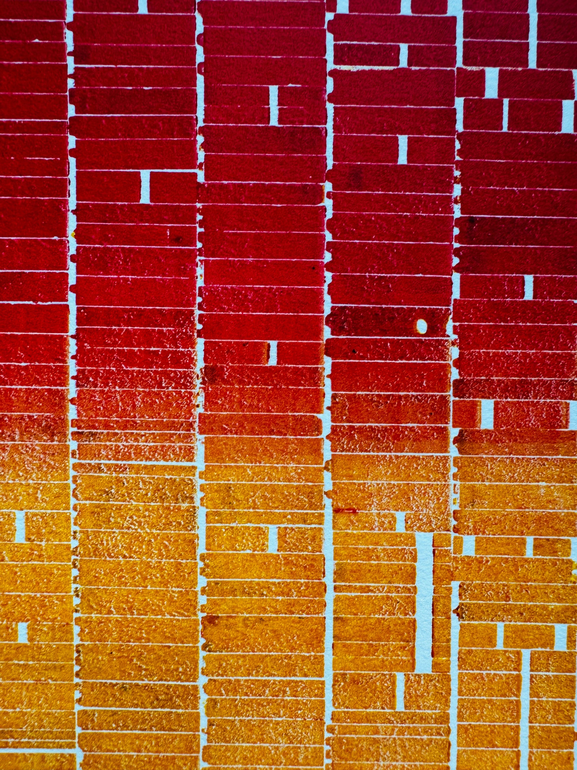 Rolled in a gradient that moves from deep crimson to warm orange, the piece celebrates both the physicality of traditional printing and the beauty found in forgotten materials. The uneven impressions, gaps, and worn edges of the letter forms create a rhythm that feels almost musical—an artifact of analog craftsmanship transformed into a contemporary visual field.